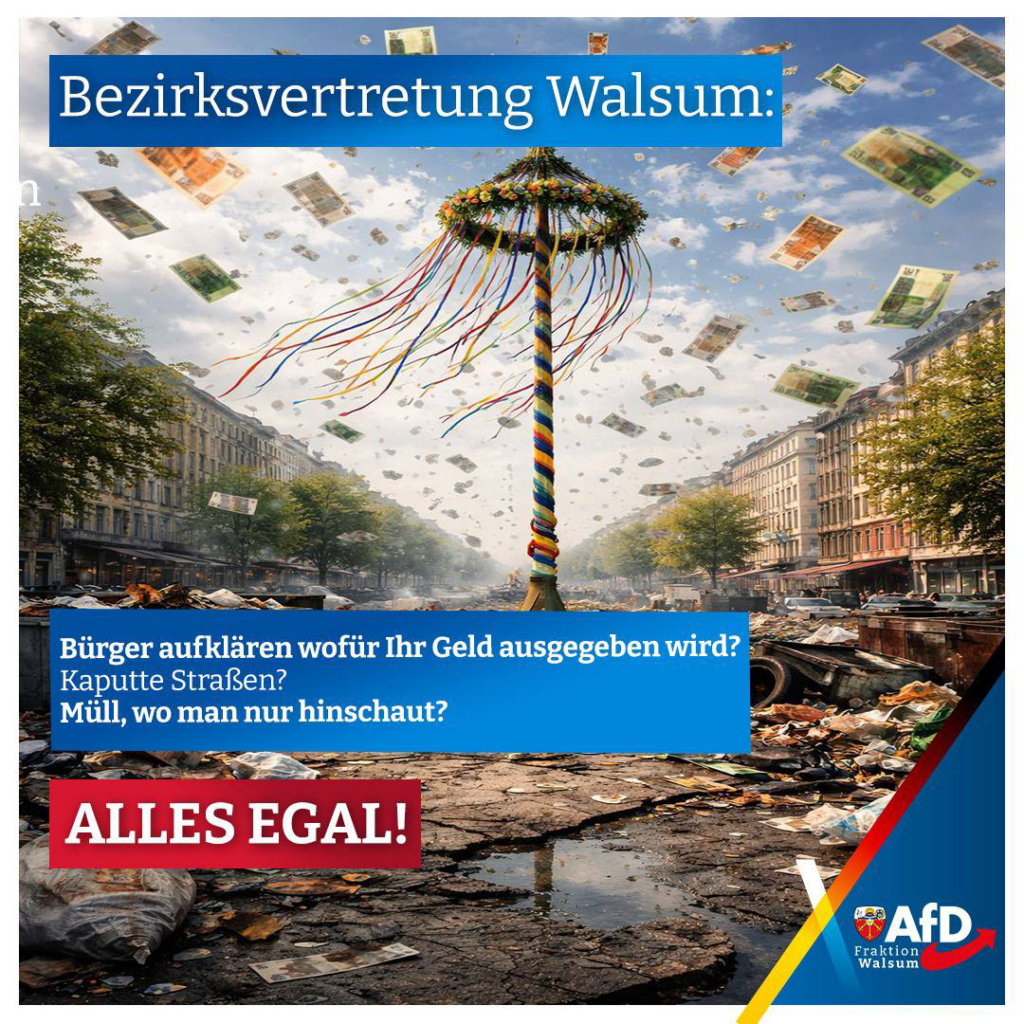 In der Sitzung der Bezirksvertretung Walsum am 15.05.2025 wurde im Rahmen der Behandlung des gemeinsamen Antrags von SPD, GrünLinks und CDU „Mittel zur Pflege des Ortsbildes 2026“ (Drucksache-Nr. 26-0018) von der AfD-Fraktion die Frage gestellt, [...]